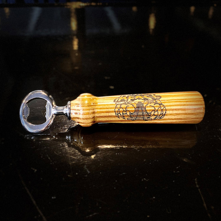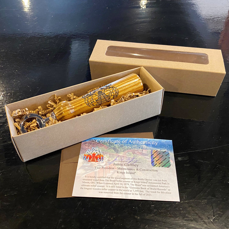 Unleash the thrills (and beverages)! Show off your love for the Beast with this limited edition bottle opener. Made from the wood previously used on the Beast, featuring a chrome top. Included is a Certificate of Authenticity from Jamie Gaffney, VP of Maintenance & Construction at Kings Island.