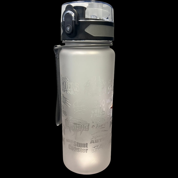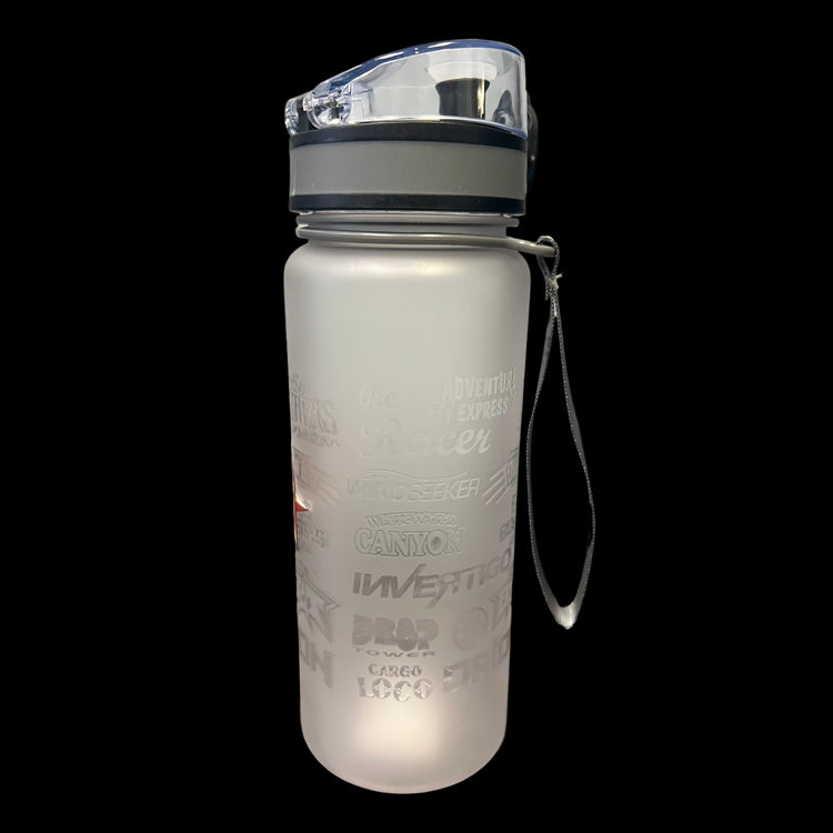 Perfect for any adventure on the go, this water bottle shows off many of the ride logos from around the park and is a must for all Kings Island fans!