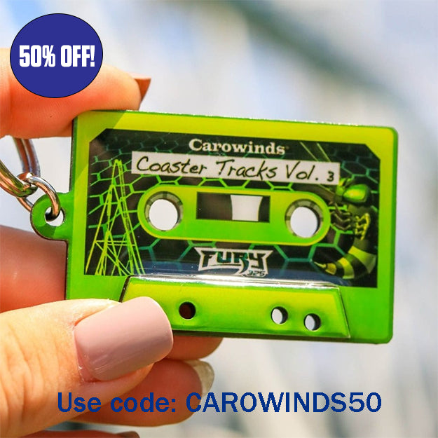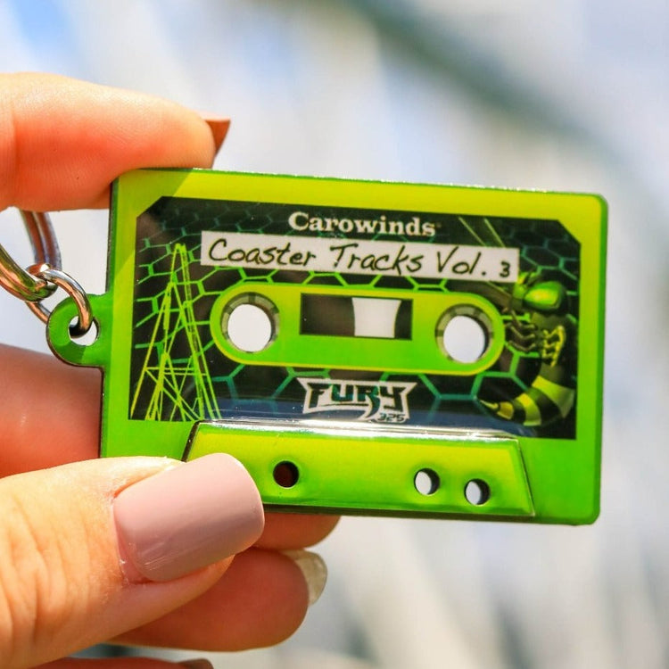 Get ready for a wild ride with the Carowinds Fury 325 Coaster Tracks Keychain! Shaped like a cassette tape, this keychain is perfect for music and coaster enthusiasts alike. Attach your keys and add some retro flair to your everyday routine. (Warning: may cause excessive jamming out while unlocking doors!)