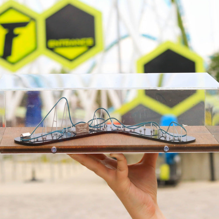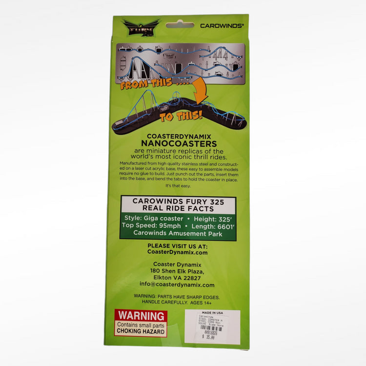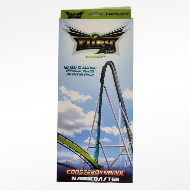 Build your own miniature replica of Fury 325, North America's tallest, fastest and longest giga coaster. It's super fun and easy! Just punch out the stainless steel parts and insert them in the acrylic base. No glue or tools needed. Some parts have sharp edges. Ages 14+.