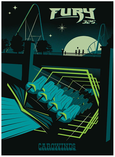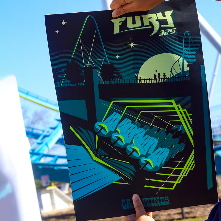 Designed by Made to Thrill, you'll definitely Feel the Sting with this poster! Being the tallest, fastest, longest giga coaster in North America, riders will experience open-air trains to the peak height of 325ft, and like an angry hornet chasing its target, riders race into a massive 190-foot tall barrel turn reaching speeds of 95mph! Do you have #FuryFever? 13" x 19"
