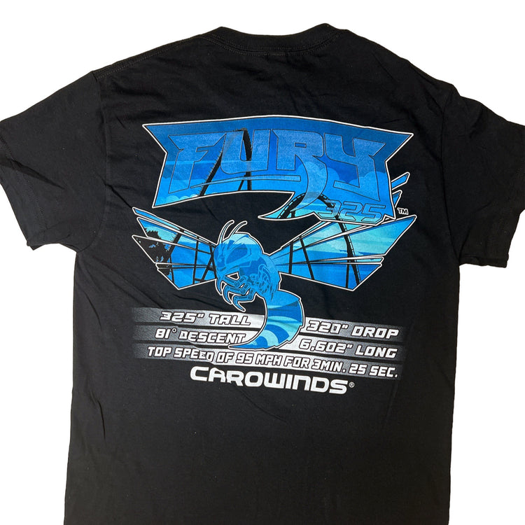 This Fury 325 Black Stats Tee is the perfect way for every coaster fan to represent their favorite ride! This tee shows off the fiery stats of the Fury 325 while also featuring its fierce mascot, the hornet. Show your excitement for coaster rides in style!