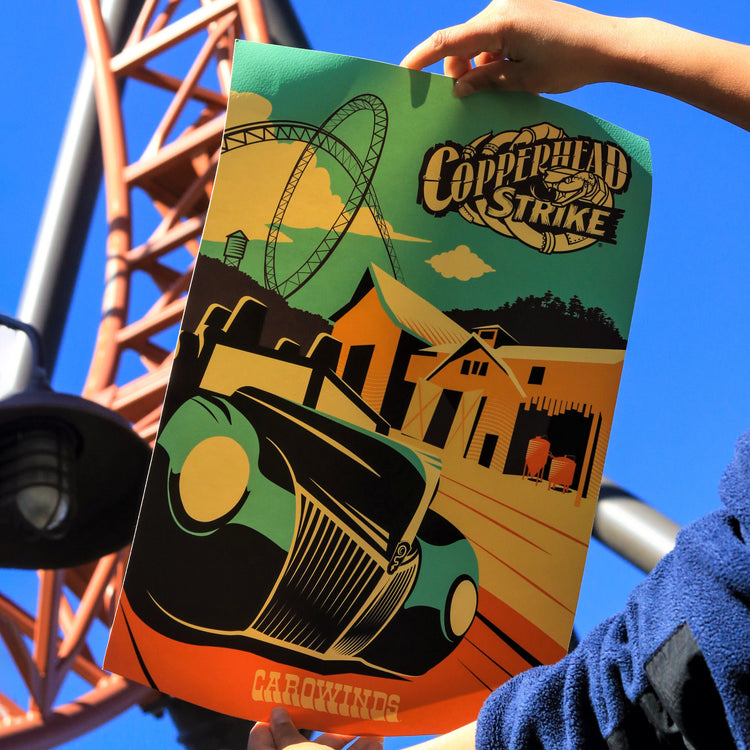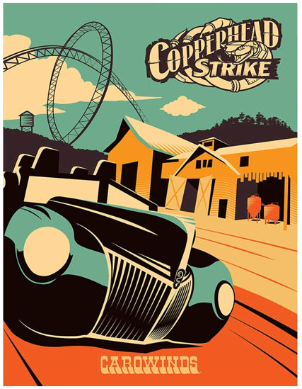 Designed by Made to Thrill, this Copperhead Strike poster showcases the getaway car used when you got caught trespassing at Granny Byrd's Barn. As the Carolina's first double launch coaster you'll go 0-42mph in 2.5 seconds twice, and get tangled in five head-over-heels inversions - the most of any double launch coaster in North America.