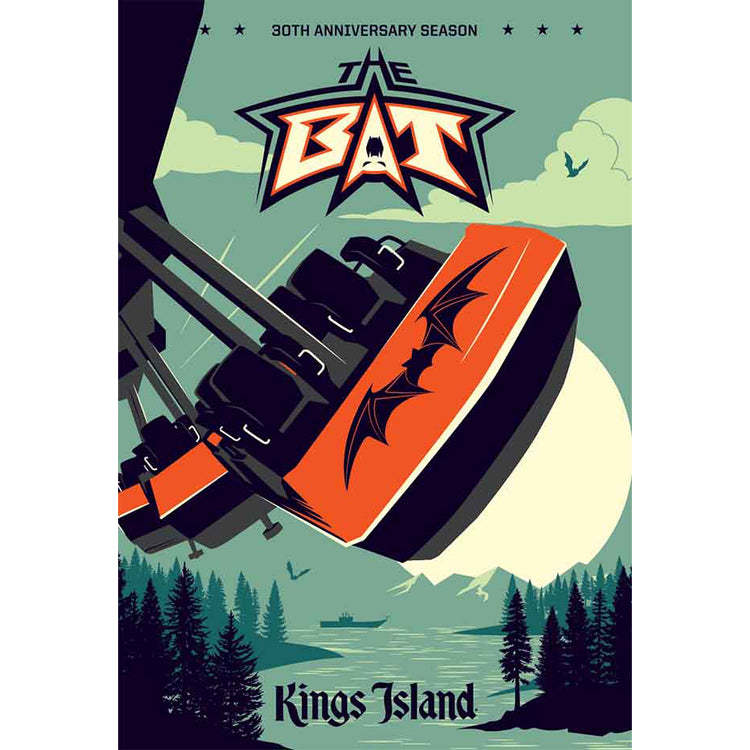 The Bat Flies Again! Celebrating its 30th Anniversary in 2023, the coaster was originally named "Top Gun", and then renamed Flight Deck in 2008, this was the park's second suspended coaster. Renamed in 2014 to pay tribute to the original ride of the same name, The Bat received a new color scheme and logo.