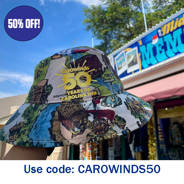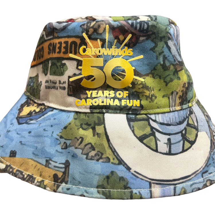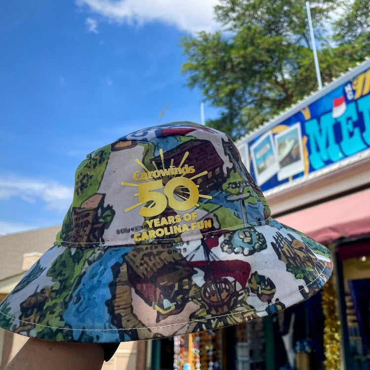 Perfect for shade from the Carolina sun and beyond! Mark an outdoor milestone with the 50th Anniversary Park Map Bucket Hat. This classic bucket hat is printed with a park map illustration, perfect for celebrating 50 years of fun!