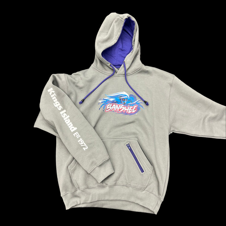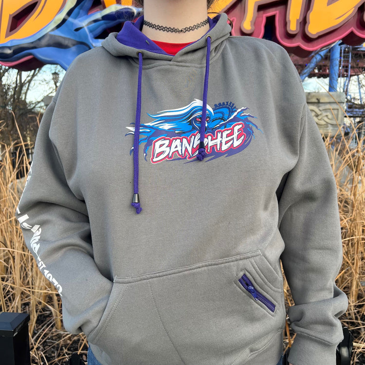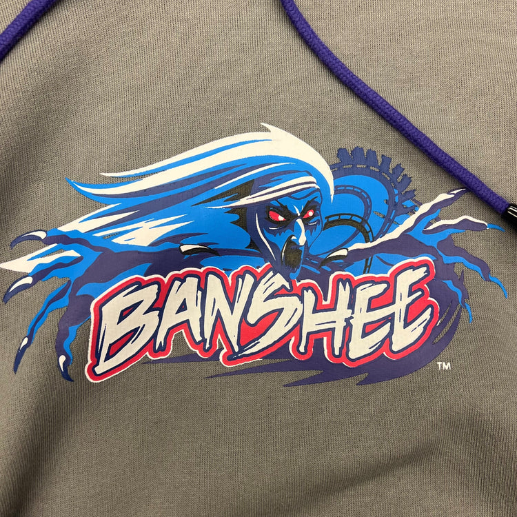 Stay bundled up with this super soft Banshee hoodie! This gray hoodie features the Banshee logo printed on the front, as well as a zipper pocket to keep your phone safe as you go through Banshee's 7 wicked inversions. 52% Cotton 48% Polyester
