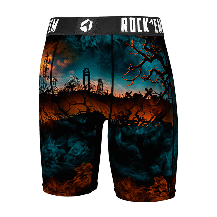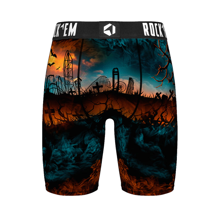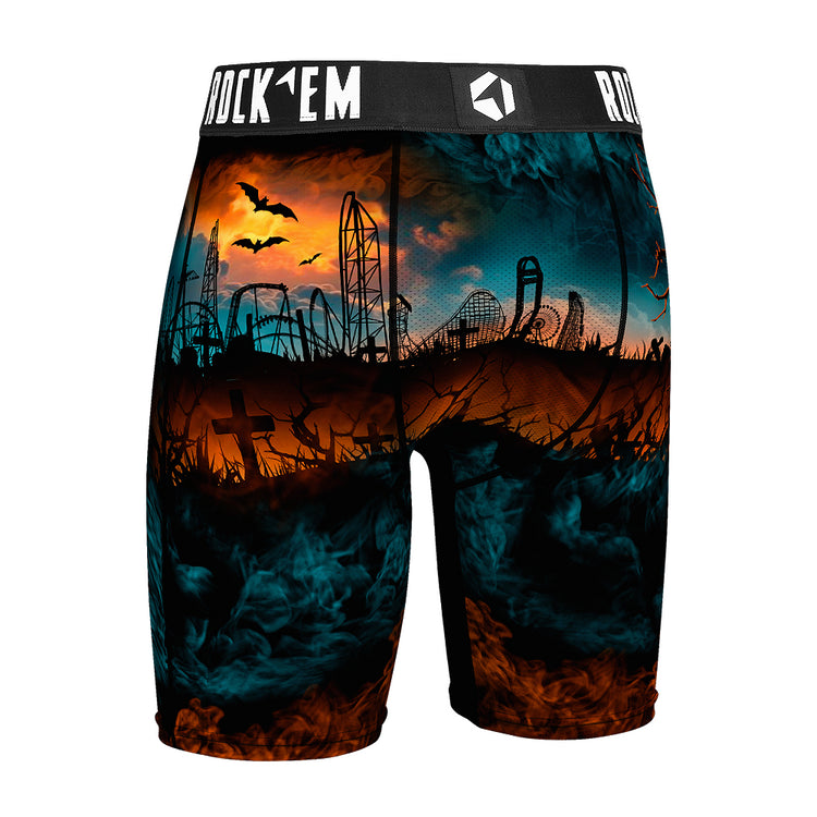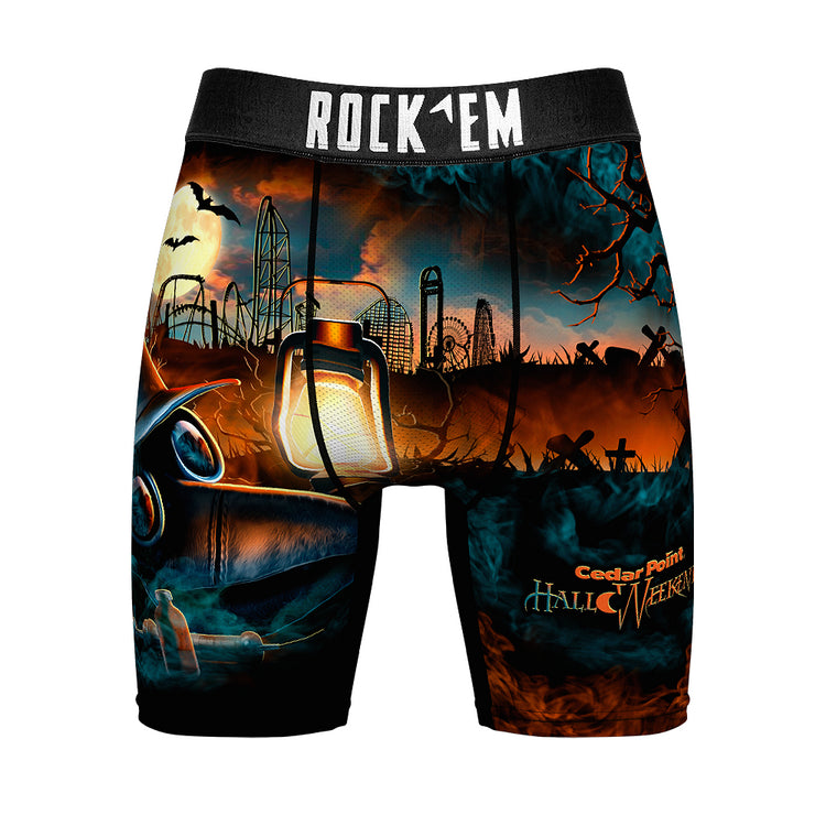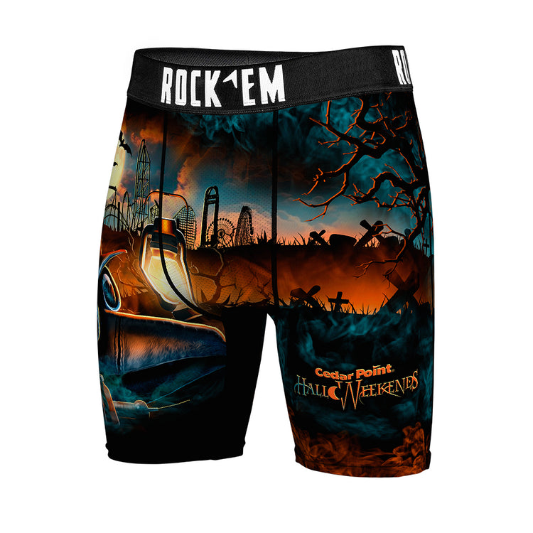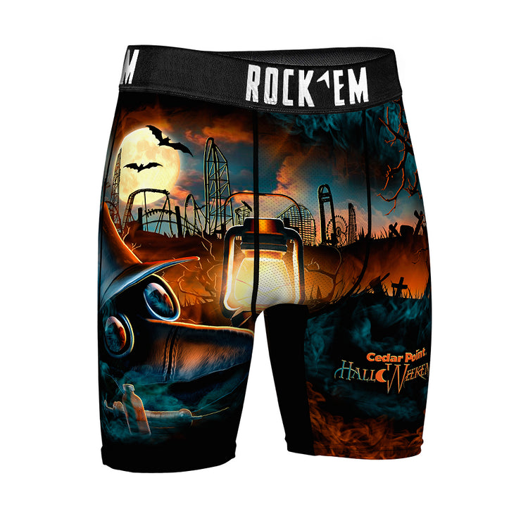 Step into spooky style with these Cedar Point HalloWeekends Plague Mask Boxer Briefs. Featuring a bold skyline and eerie plague doctor design, they add a playful twist to your everyday essentials. Comfortable and fun, these briefs are perfect for fans of the season looking to keep the Halloween spirit close all day long.