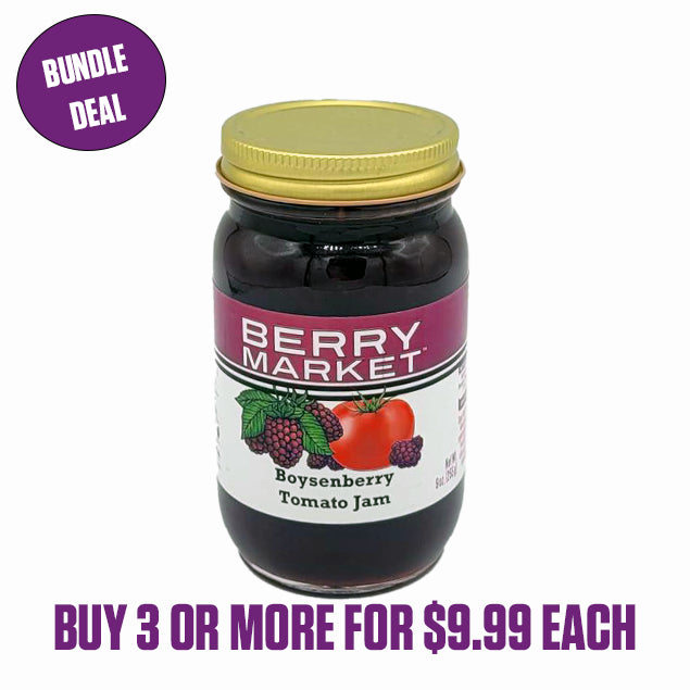 Ingredients: Sugar, Diced Tomatoes (tomatoes, tomato juice, salt, citric acid, calcium chloride), Boysenberries, Pectin Mix (sucrose, pectin, citric acid), Lemon Juice (with natural flavors), Spices