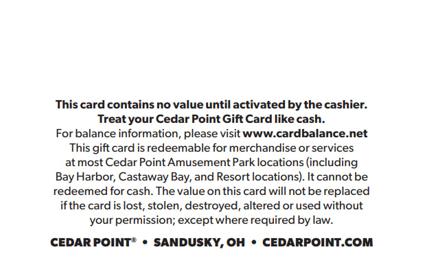 This gift card is redeemable for merchandise or services at most Cedar Point Amusement Park locations (including Bay Harbor Inn, Castaway Bay, and Resort locations). It cannot be redeemed for cash. Gift cards are not valid for any online purchases.