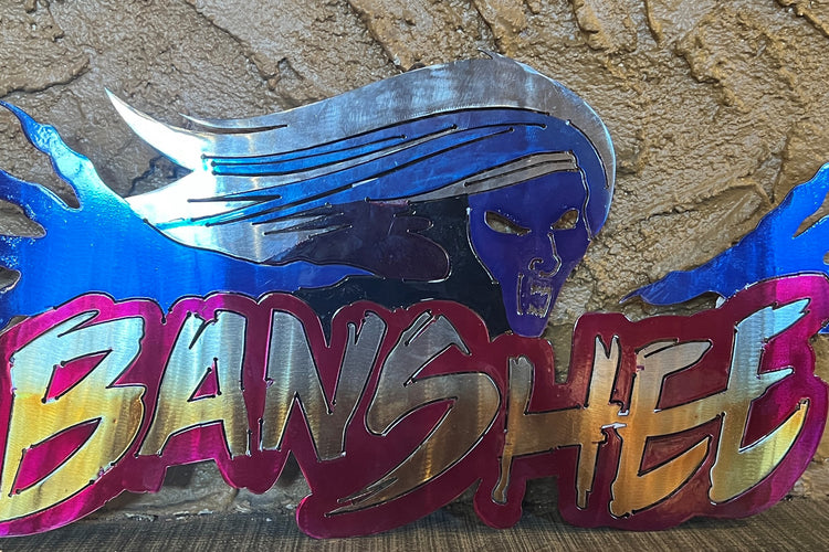 Spice up any room in your home or office with this metal sign featuring the Banshee logo! The design is laser cut and painted by a local Ohio artisan and features LED Backlights that can be changed to any color. Dimensions 20" W x 18" H.