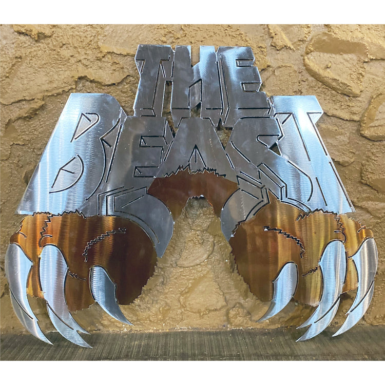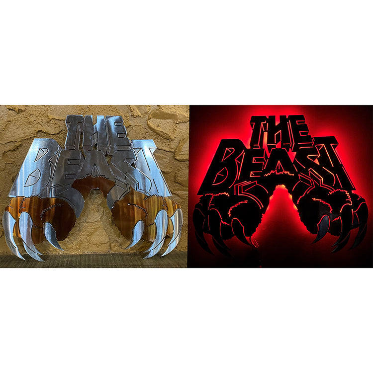 Spice up any room in your home or office with this metal sign featuring the Beast Logo. The design is laser cut and painted by a local Ohio artisan and features LED Backlights that can be changed to any color. Dimensions 20" W x 16" H.