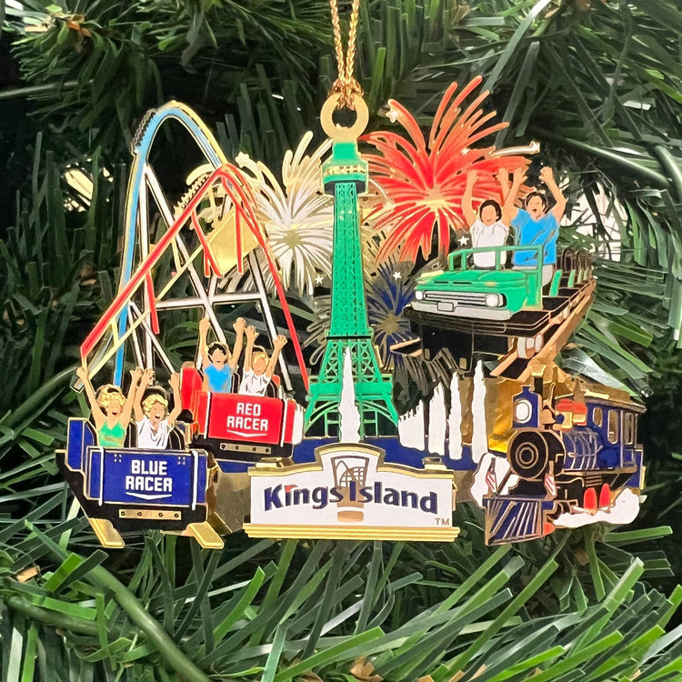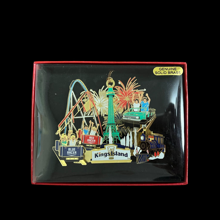 It's the most wonderful time of the year! This genuine brass ornamanet is sure to be great in your home for the holidays, featuring the Royal Fountain, Eiffel Tower, Mystic Timbers, Diamondback, Orion and the Racer!