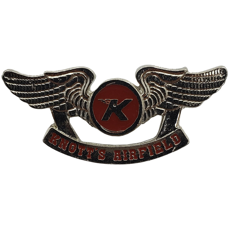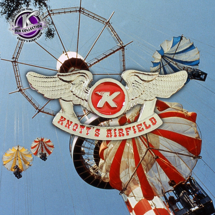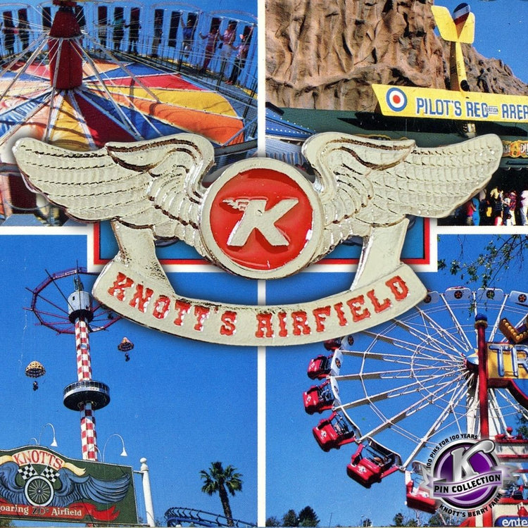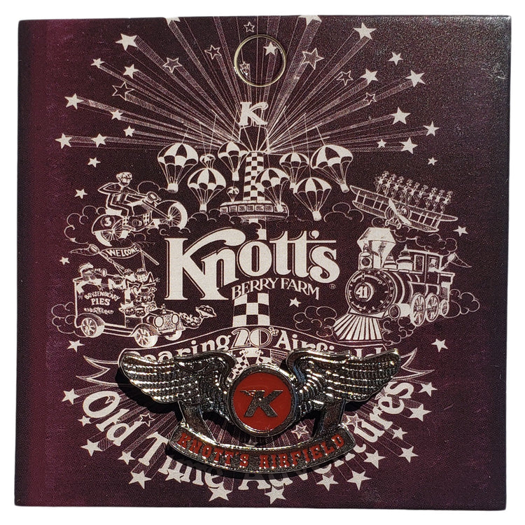 The distinctive Flying K logo announced the arrival of Knott's Airfield in 1976 as part of the Roaring 20's expansion. Rides, games and eateries were all themed around the barnstorming era of daredevil pilots who claimed the sky as their own! You could find the Flying K on the signage leading into the land and even on the custom railing at Captain Kelly's Buffet. Rides, games and eateries were all themed around the barnstorming era of daredevil pilots who claimed the sky as their own! Climb into your biplane and take to the skies with this limited-edition pin before it vanishes into the clouds!