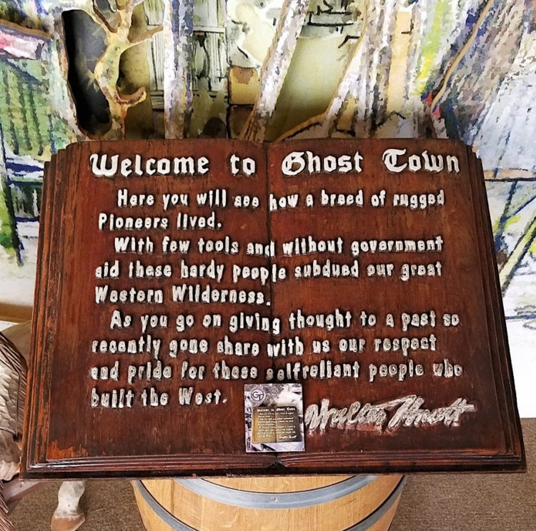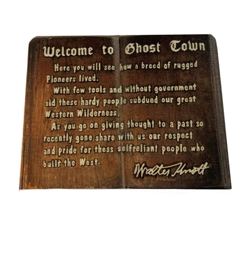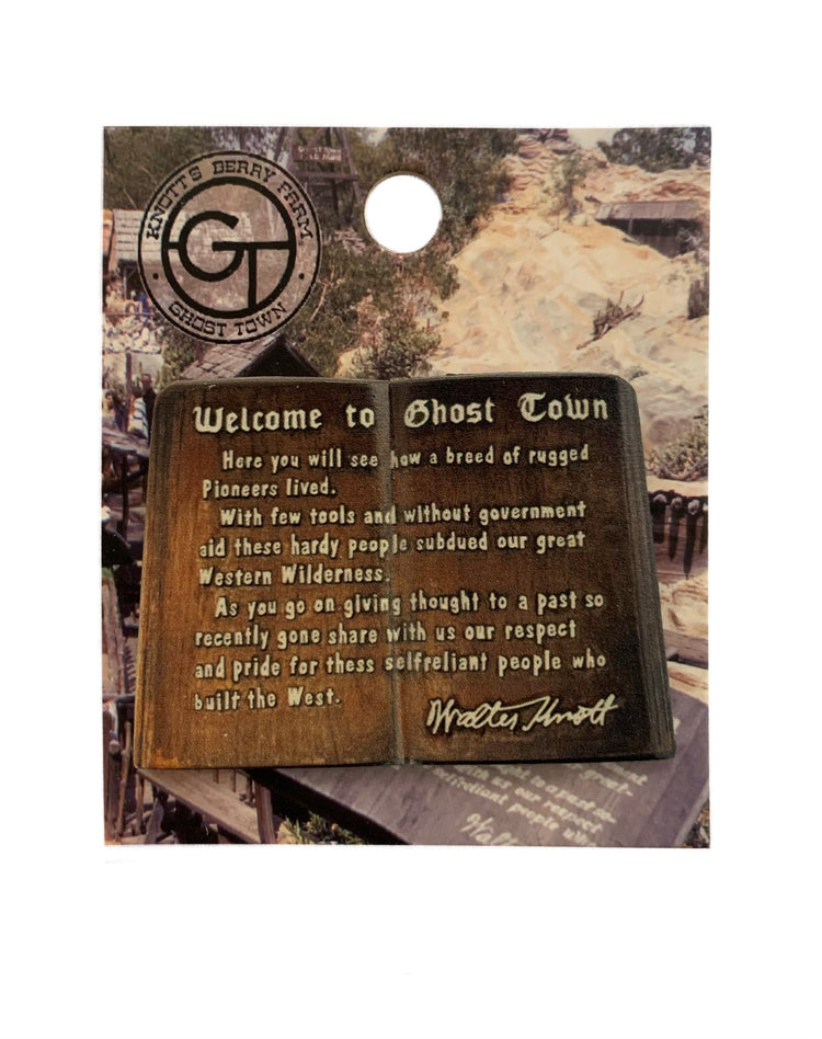 Welcome to Ghost Town! This hand-carved, wooden book was mounted near the Pan for Gold entrance gates to Ghost Town as a personal reminder from Walter Knott. Ghost Town was built as a tribute to the American pioneers who settled the West and their accomplishments. Knott hoped the book-shaped sign would remind his guests of those stalwart pioneers from days past.