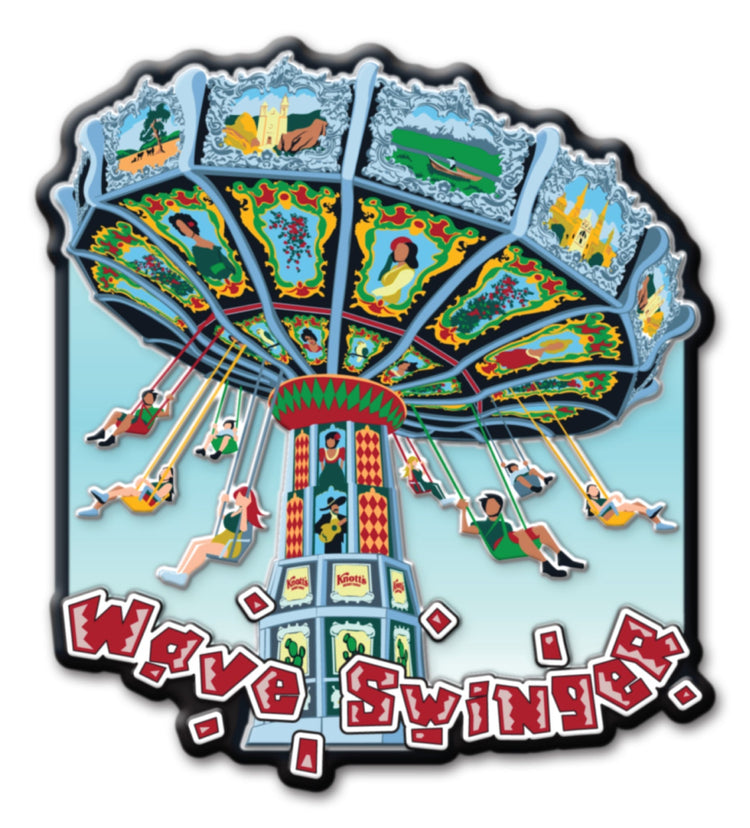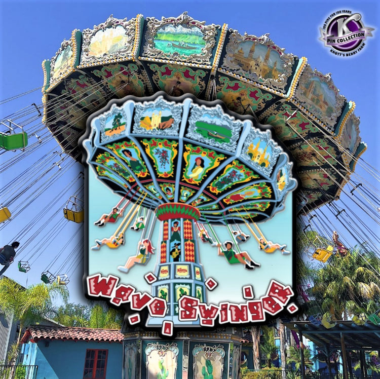 Knott's delivers a classic theme park experience with Waveswinger, located in Fiesta Village. Climb aboard your individual swing for an exhilarating journey 40 feet above the midway! And don't forget the classic art that is revealed as Waveswinger slowly rises above Fiesta Village! Your pin collection isn't complete without this classic Fiesta Village ride that has been thrilling riders of all ages since 1986. Be sure to grab one before it swings out of the park!