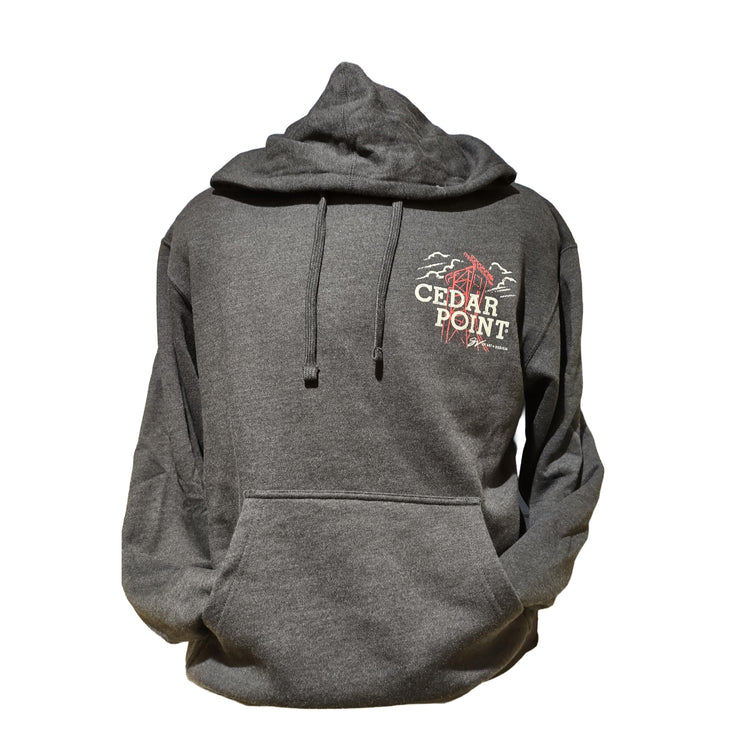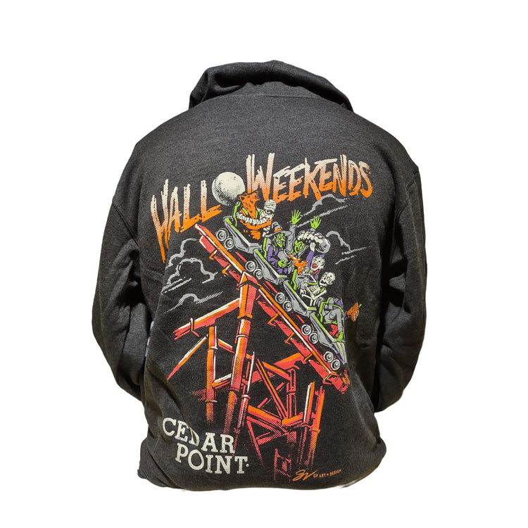 Show off your spooky side with the Cedar Point HalloWeekends Siren's Curse Hoodie! This playful design brings together iconic ghouls and Halloween characters as they take on the thrilling Siren's Curse ride.