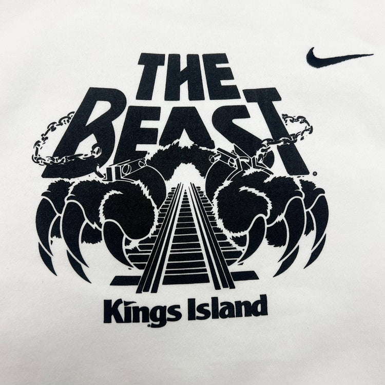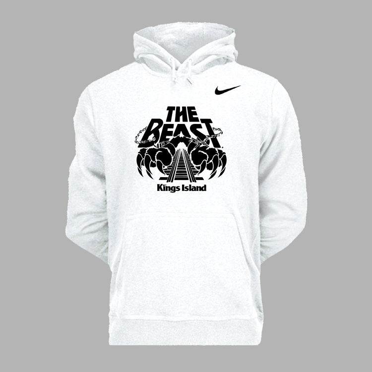 Ignore the screaming in the woods! Warm up with this Nike hoodie featuring the world's longest wooden roller coaster, The Beast! This white hoodie features The Beast logo screen printed in black, as well as the Nike logo embroidered on the front. 100% Cotton