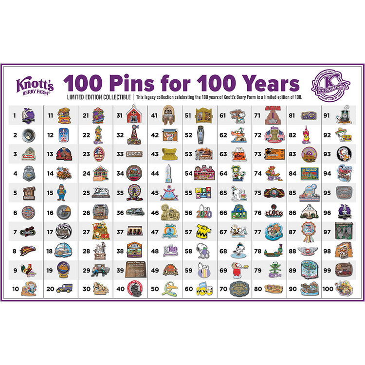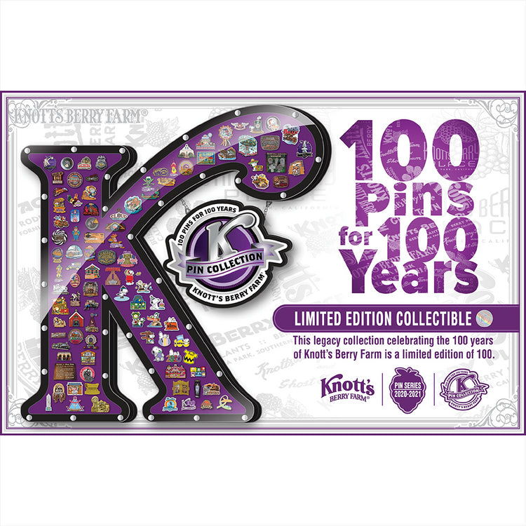 The wait is over! The Knott’s Collectible 100 years in the making is here! The original pin set took 2 years to complete – this limited-edition large size Knott “K” collects all 100 pins in a magnificent collector’s edition sure to be the centerpiece of your collection. Containing all 100 pins, the “K” is a beautiful way to celebrate the Knott’s Berry Farm Centennial. All 100 pins and their respective cardbacks are included in this show stopping display. There are only a limited number of these available, so don’t delay…