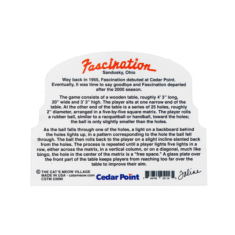 Made in Ohio by Cat's Meow. Each Cat's Meow shelf sitter is colorfully printed on 3/4" thick wood and provides details on the back.