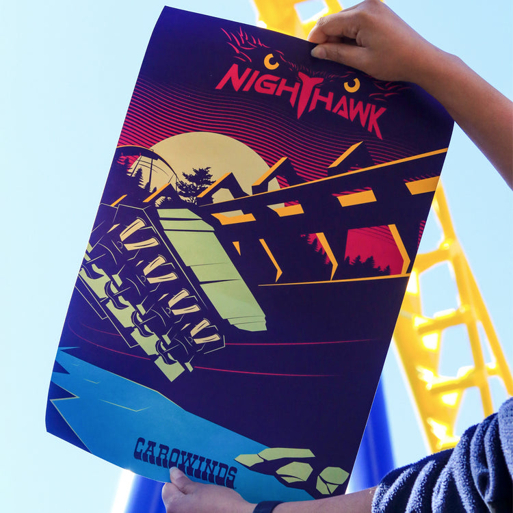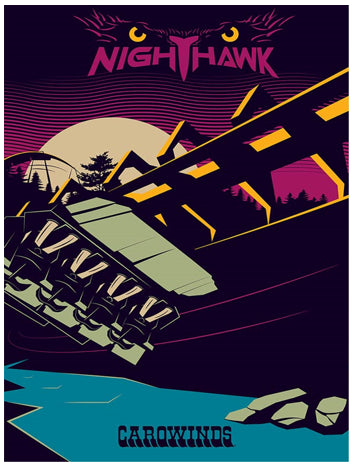 Designed my Made to Thrill, this Nighthawk poster showcases the closest thing you'll get to flying without growing wings! Just like a hawk, the train dives headfirst towards the water below. Reaching speeds on 51mph, the unique rider position offers breathtaking and virtually unobstructed views of the park. 13" x 19"